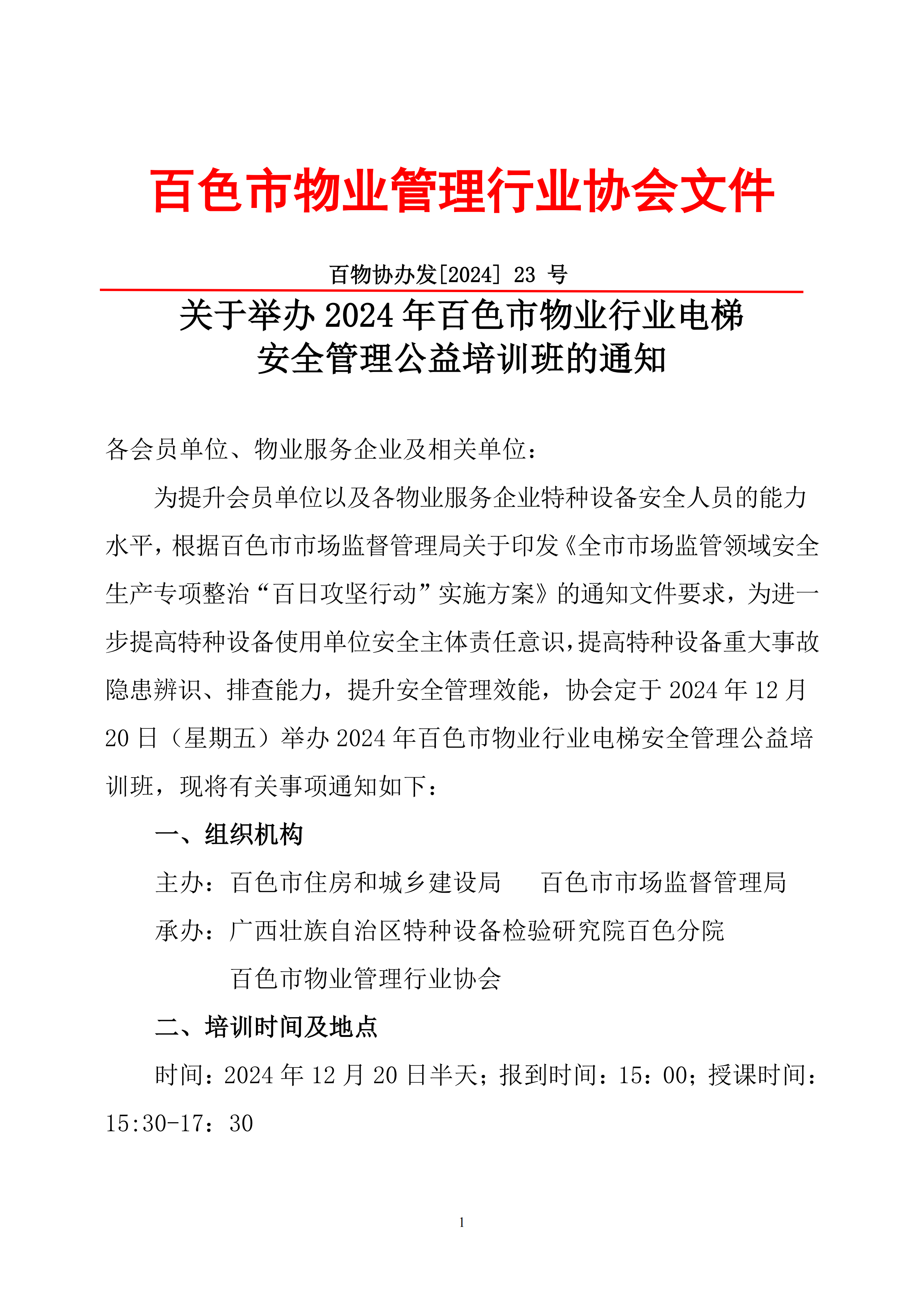 关于举办2024年百色市物业行业电梯安全管理公益培训班的通知
